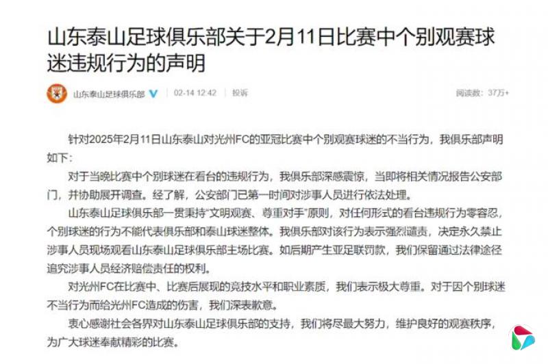 山东泰山称,一贯秉持“文明观赛、尊重对手”原则,对任何形式的看台违规行为零容忍,个别球迷的行为不能代表俱乐部和泰山球迷整体。对该行为表示强烈谴责,决定永久禁止涉事人员现场观看山东泰山主场比赛。