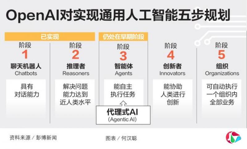 2024年7月,OpenAI内部发布了一个五步规划表,将AI发展分为五个阶段。智能体位处第三阶段。在发布这个规划时,OpenAI内部还坚信,他们只处在第一阶段。