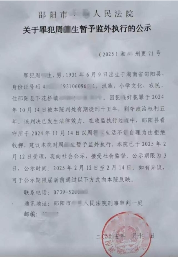 这份官方公文显示,年高93岁的邵阳县周姓农民,去年10月因强奸罪被法院判入狱15年。不过,邵阳县看守所去年11月以周姓老翁“生活不能自理”为由拒绝收押,建议对犯人暂予监外执行。邵阳中院今年2月12日受理后,向社会公示三天。