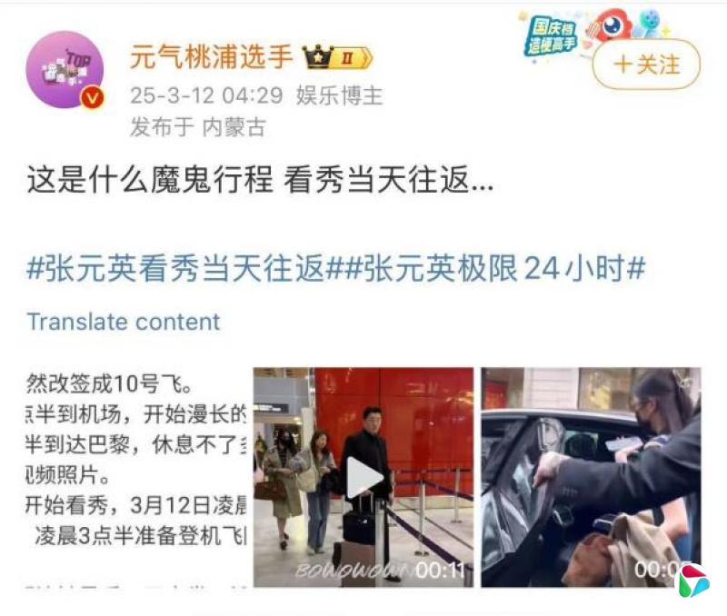 事缘韩国女星张元英本月参加巴黎时装周活动,有微博娱乐营销号3月12日发帖称,张元英坐12小时飞机当日往返,形容是“魔鬼行程”。