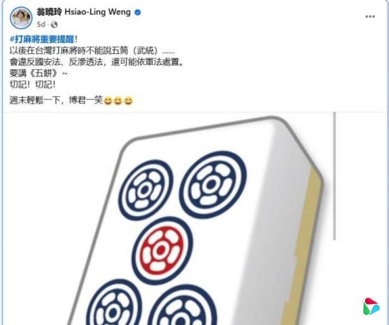 在野国民党立法委员翁晓玲事后在脸书发文调侃称,以后在台湾打麻将不能讲“五筒”,要叫五饼,否则会违反台湾所谓的“国安法”“反渗透法”,还可能依军法处置。