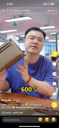 例如,敦煌网4月16日在TikTok官方账号上传视频,出镜人员直接点名奢侈品牌爱马仕(Hermès),他拿出一款外形酷似爱马仕招牌产品“凯莉包”的提包,指专卖店卖2万3600美元的凯莉包,在广州批发价只需600美元。他也从皮质、五金、缝线、包装逐步拆解成本,强调手上的包和爱马仕正品是一样的材质、一样的工艺,“无品牌税,十分之一的价格”。
