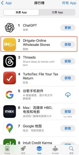 据中国媒体报道,敦煌网应用上星期五(4月11日)还在美国苹果应用商店App Store免费榜排名第352位,本周一(14日)就大幅跃升至第三位,隔天再攀升一位,仅次于美国人工智能聊天机器人ChatGPT,排名在短短五天内如同坐火箭般跃升,几乎复刻了今年1月TikTok面临在美被禁危机时,社媒平台小红书的流量奇迹。