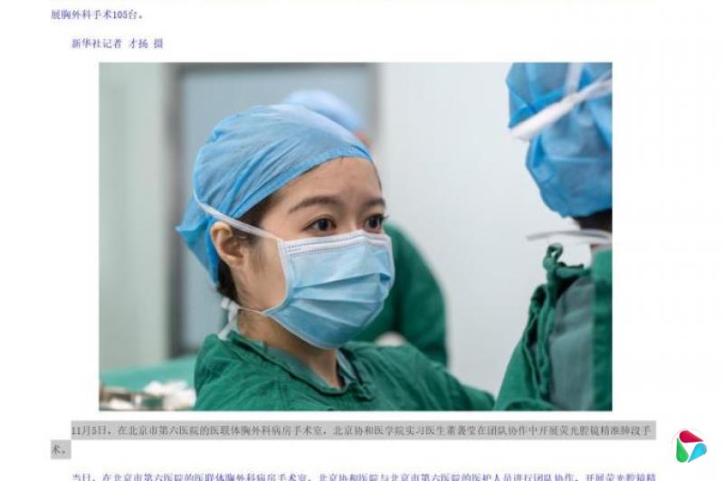 2021年,中国政府网转载一篇“北京:医联体开展荧光腔镜精准肺段手术助力患者健康”报道中,一张配图的图说为“11月5日,在北京市第六医院的医联体胸外科病房手术室,北京协和医学院实习医生董袭莹在团队协作中开展荧光腔镜精准肺段手术。”