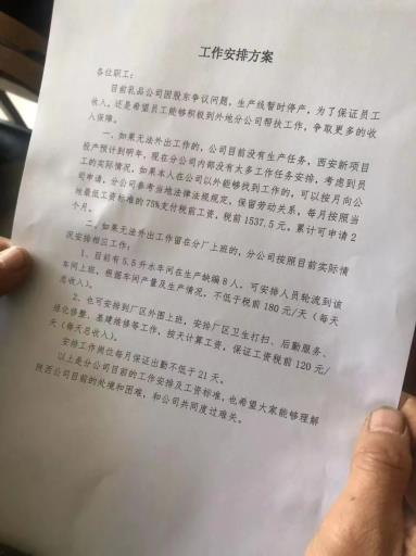 经政府相关单位协调,娃哈哈陕西公司最终给出工作安排,称因股东争议,生产线暂时停产,建议员工前往外地分公司帮扶工作以保障收入,并为无法外出的员工提供相应措施。