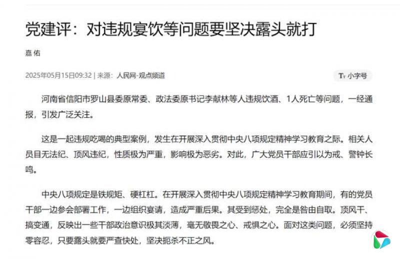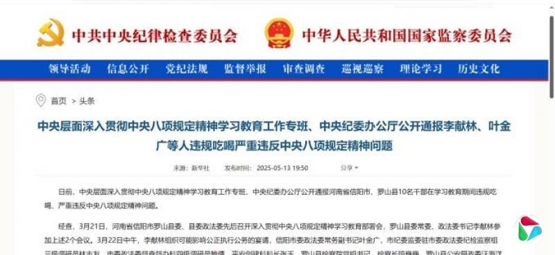 近1800字的报道开头写道,日前,中共中央层面深入贯彻中央八项规定精神学习教育工作专班、中央纪委办公厅公开通报河南省信阳市、罗山县10名干部在学习教育期间违规吃喝、严重违反中央八项规定精神问题。