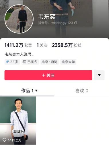 韦东奕的抖音账号在上周三(6月4日)晚发布首条视频,时长仅4秒,视频中的他站在一块黑板前,有些紧张拘谨地说:“大家好,我叫韦东奕,这是我的个人账号”。该账号在中国高考前一天(6日)引起网络关注,粉丝数量当天从1万左右暴涨至近千万,星期一(9日)已突破2300万。