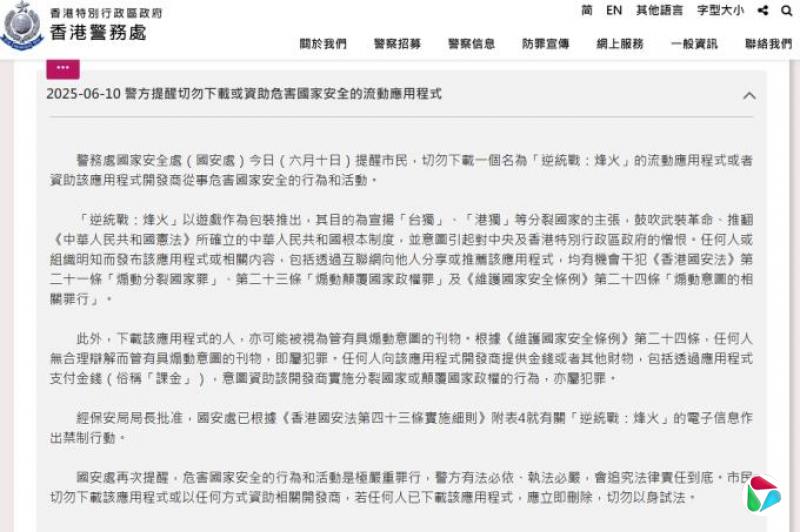 香港警务处国家安全处(简称国安处)上周二(6月10日)在官网发布一则不到600字的公告。公告第一句写道:“提醒市民,切勿下载一个名为《逆统战:烽火》的流动应用程序或者资助该应用程序开发商从事危害国家安全的行为和活动。”