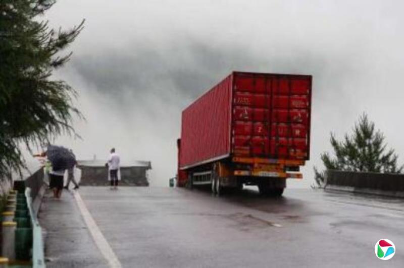 网传视频显示,一辆红色货车卡在断桥边缘,车头已经悬空,车身还留在路面,货车司机尚待在车头。