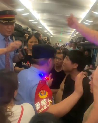 中国一辆高铁列车7月2日晚因被货物列车冲撞脱轨,在浙江金华临时停运抢修三小时,密闭车厢内闷热难耐,室温一度高达38摄氏度,有人疑似缺氧中暑,引发乘客怨声载道。列车员却不愿开车门透气,一名乘客愤而砸破车窗通风,结果被警方带走。