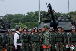 台湾赖清德星期四(7月10日)在新竹视导美制M1A2T新式坦克换装训练并进行实弹射击演习。他说,这款坦克未来将与无人机搭配落实战略目标。