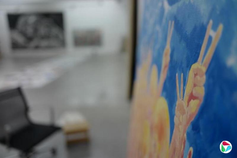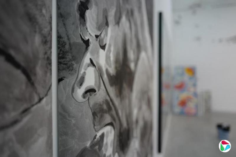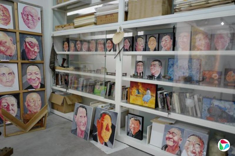 他指向墙上几幅尺寸巨大的水墨,“这些是刚完成的,还有那些还在干。”另一侧墙面上则悬挂着油画和许多肖像,色彩沉稳,画面密集。