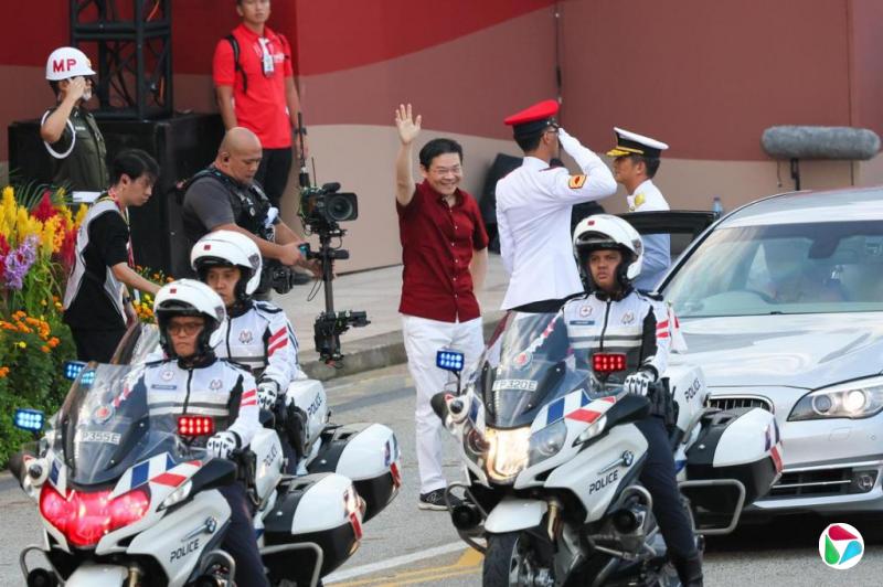 新加坡总理黄循财星期六(8月9日)抵达政府大厦前大草场,向热情的观众挥手致意。这是他第二次以总理身份出席国庆庆典。(张俊杰摄)
