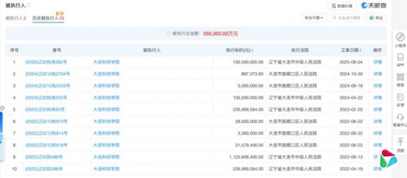 大连科技学院历史被执行人信息共35条,总金额超35亿元。