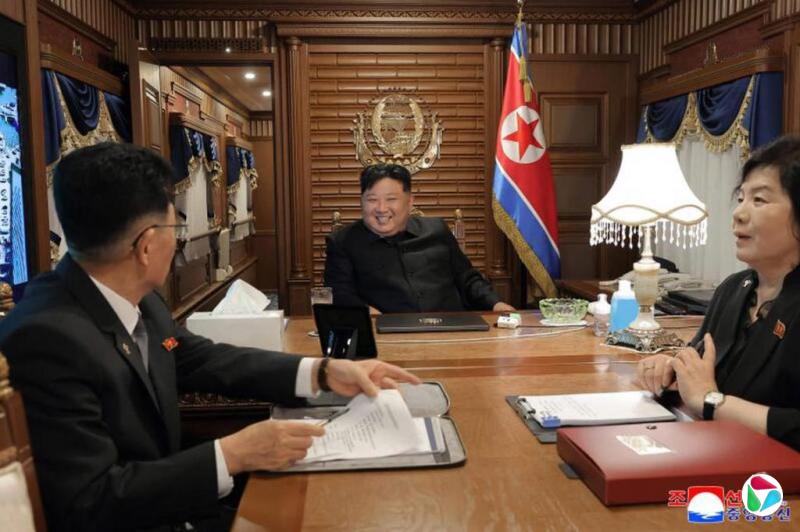 路透社也报道,朝鲜官方媒体星期二发布的照片显示,金正恩与高级官员在一节印有金色徽章与饰条的绿色车厢旁抽烟休息。他还出现在一间木质镶板办公室里,背后摆放着一枚大型金色徽章,两侧是朝鲜国旗。