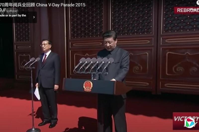 2015年,习近平在中国抗战胜利70周年纪念大会上发表讲话时,时任中国总理李克强是主持人,央视直播有两人同框画面。(央视视频截图)