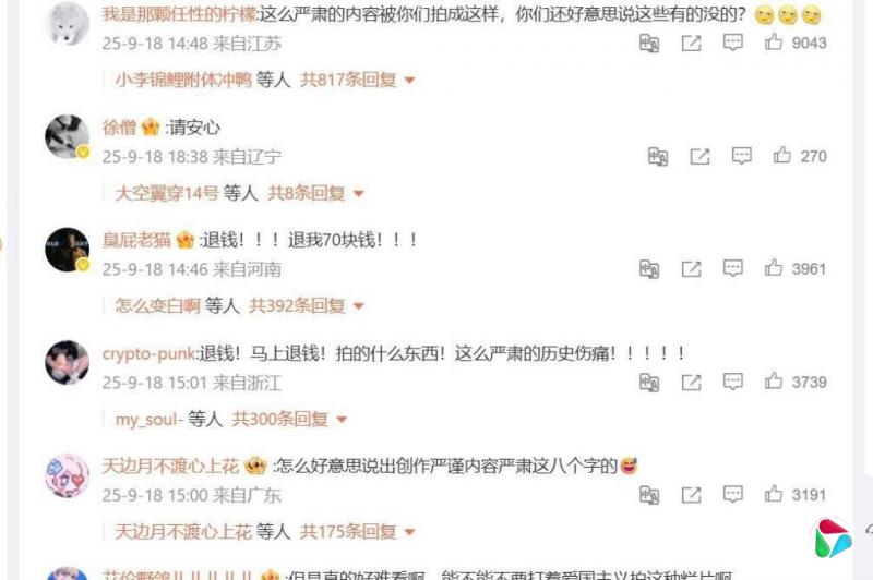 因此,《731》官方微博账号的留言区在电影上映后画风突变,原本因爱国情绪而一面倒支持电影的声音,被不断涌入的网民批评淹没,“拍成这样,对得起列祖列宗吗”“导演是日本人吧”“日本本来就不承认731和(南京)大屠杀,看了这电影更乐了”,要求“退钱”的声音更是不绝于耳。