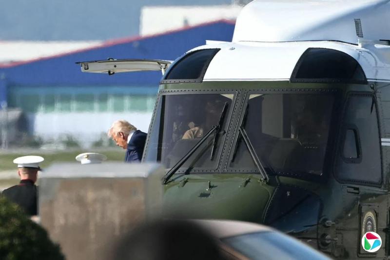 美国总统特朗普星期四(10月30日)乘坐海军陆战队一号直升机,抵达釜山金海国际机场,以出席美中两国元首会晤。(法新社)