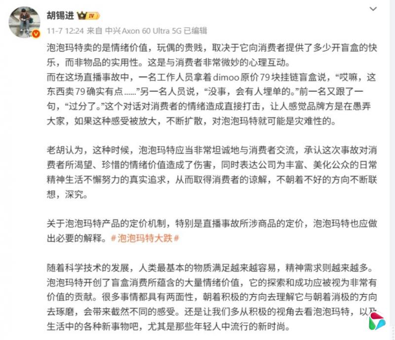 胡锡进11月7日在微博发文称,泡泡玛特卖的是情绪价值,玩偶的贵贱,取决于它向消费者提供了多少开盲盒的快乐,而非物品的实用性。他还说,这是与消费者非常微妙的心理互动。(胡锡进微博截图)