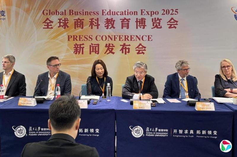 “全球教育博览会”10月23日在复旦大学管理学院举行,复旦管院院长陆雄文(右三)等商学院代表出席发布会。(黎康摄)