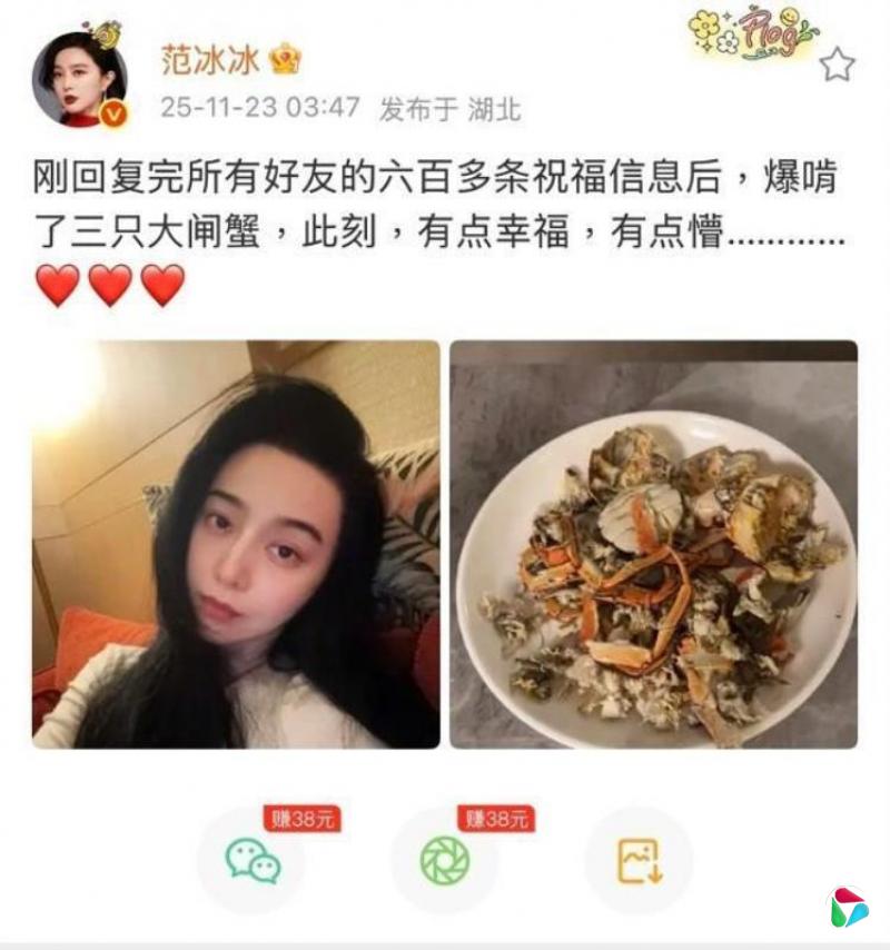 范冰冰本身于11月23日凌晨在微博上发文表示,“刚回覆完所有好友的六百多个祝福讯息后,爆啃了三只大闸蟹,此刻,有点幸福,有点懵……”,并附上一张自拍照,以及一盘大闸蟹的照片。