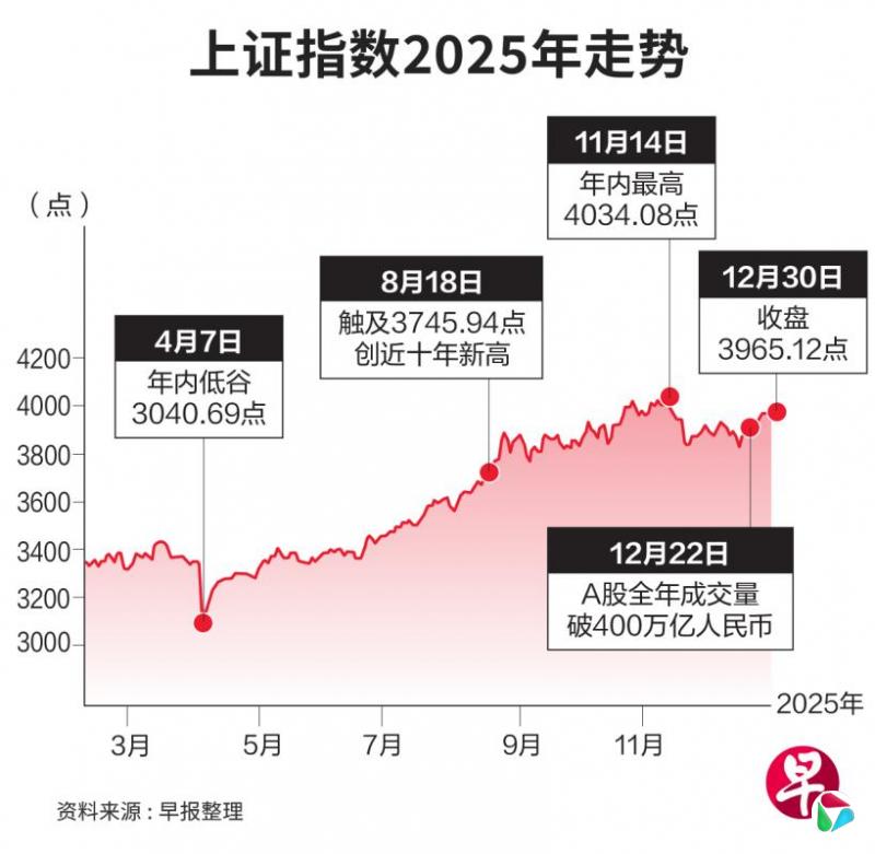 中国股市今年4月触及低谷回弹后,过去几个月一路上扬。上证指数8月时隔10年重返3800点,11月更突破4000点关口;尽管12月有所回落,但仍维持在3800点以上,星期二(12月30日)收报3965.12点,年内涨幅超20%。