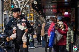 中国官方数据显示,2025年中国人口已连续第四年下降。图为上海一名老人抱着婴儿,另一名女士抱着宠物狗走在街头。(法新社)