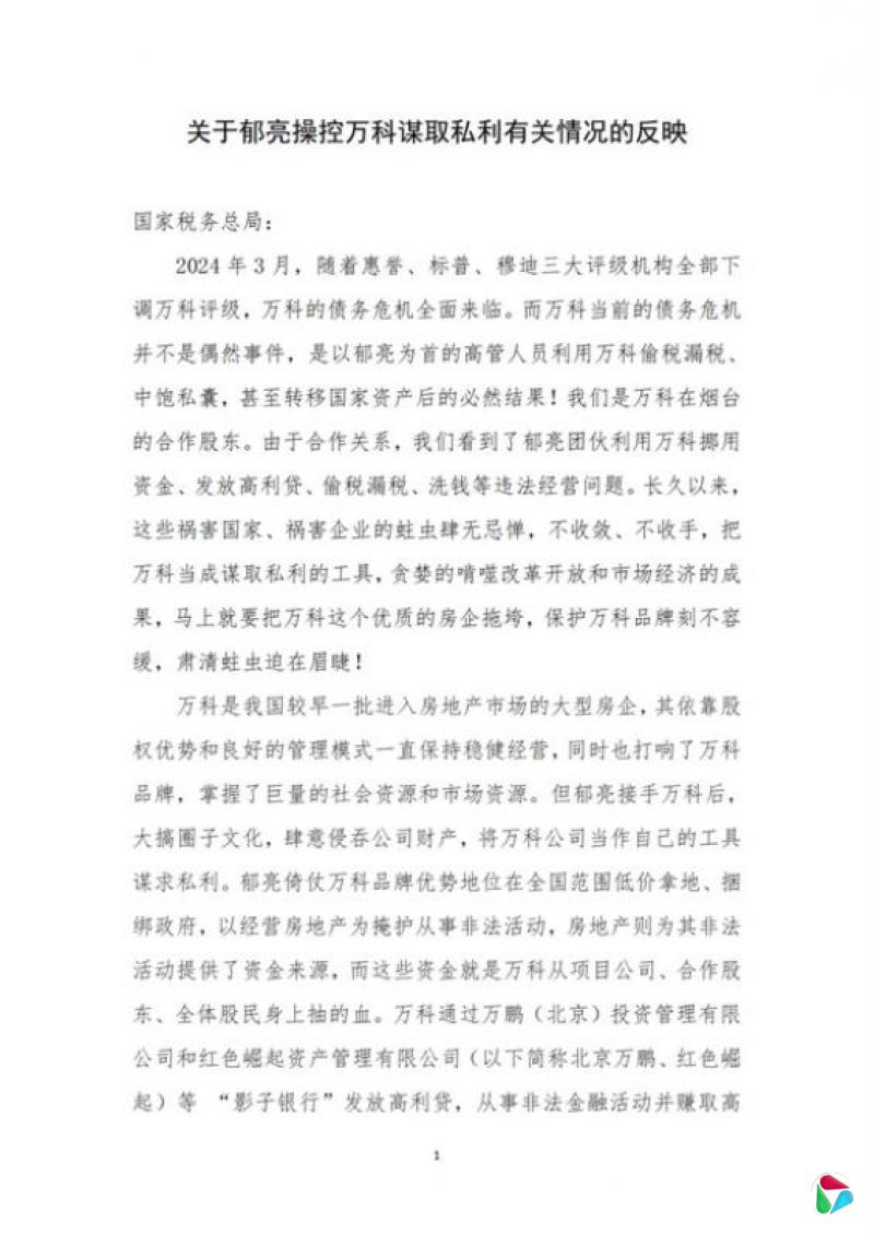 2024年1月18日起,以百润置业为首的多家万科合作方实名举报郁亮,指他操控万科谋取私利,涉嫌挪用合资项目资金,金额近5亿元人民币。同年2月和4月,百润置业发布多份举报信,直指万科管理层通过大量影子公司构建隐秘资金通道,进行资金挪用、高利贷和税务违规等行为。