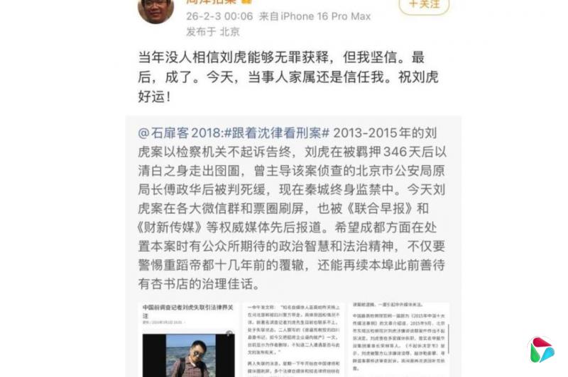不过,曾与刘虎对簿公堂的前新华社记者汤计,则在微信上转发一篇题为《据我判断,刘虎这次在劫难逃》的文章。
