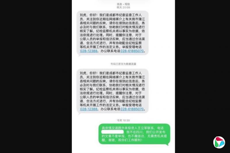 成都人大会议上星期六(31日)闭幕当天,刘虎便收到来自成都市纪委监委工作人员的短信。短信中称:“请你在接到此信息后,务必及时与我们联系......同时提醒你注意,对于公职人员的举报和信访反映,应当通过合法渠道、合法方式进行。”