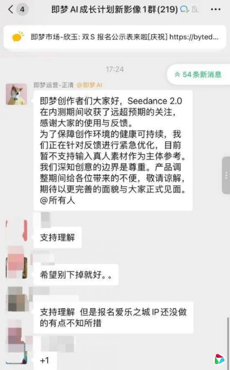 网传微信聊天截图显示,在一个字节跳动运营的创作者微信群组中,即梦AI运营人员发消息称,Seedance 2.0在内测期间收获远超预期的关注,“为了保障创作环境的健康可持续,我们正在针对反馈进行紧急优化,目前暂不支持输入真人素材作为主体参考。”