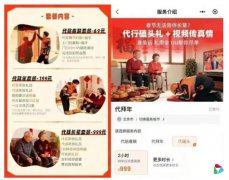 据UU跑腿App,“代拜年套餐”包含代买代送年货礼品、向长辈亲友求红包等服务,2小时199元;“代拜长辈套餐”除了代买代送年货礼品外,还提供1分钟吉祥话祝福、代行磕头礼、实时视频直播等服务,2小时收费999元。服务介绍写道“身虽远,礼周全,UU帮你尽孝”。