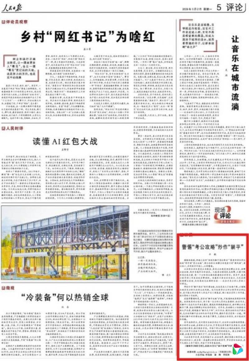 星期一(3月2日)出版的《人民日报》,刊发题为《警惕“考公攻略”炒作“躺平”》的评论文章称,网络上流传“体制内躺平岗位排名”“最清闲神仙单位指南”等所谓考公攻略,将公共职位曲解为安逸度日的避风港,“看似贴心,实则误导年轻人,必须警惕”。