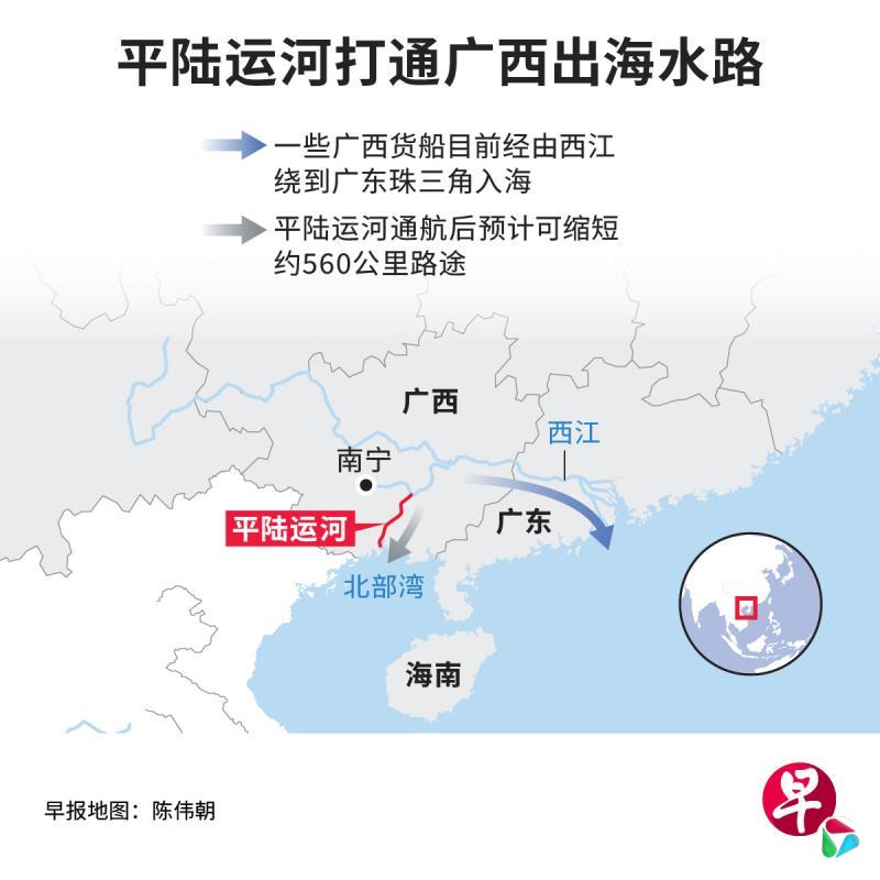 平陆运河的开通,正是为突破运量的局限。南宁至钦州实现“江海直连”,意味着西南水系增加一条出海通道,较目前从广东出海缩短560公里路途。