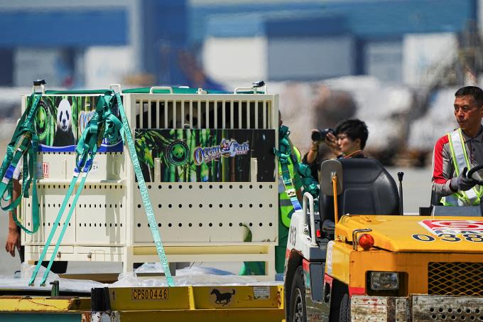 据香港01报道,大熊猫被放入透孔的白色笼子中,由飞机尾段的舱门运出机舱,再经升降平台载往地面。笼子外绑满绿色的丝带,还贴上大熊猫和海洋公园标志的贴纸。