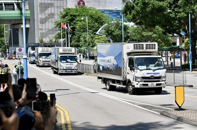 星期四下午1时半左右,两只大熊猫由车队送至香港海洋公园,道路周边引来不少民众围观。(中新社)