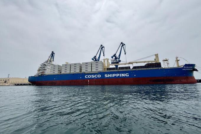 在秘鲁钱凯镇(Chancay)一片悠闲的沙滩外,一艘载满集装箱的巨型货船,停泊在数十艘简陋的小渔船间中,庞大得有些突兀。不久后,这艘货船将启航前往中国上海,并承载宏大的愿景:让钱凯崛起成为“拉丁美洲的新加坡”。