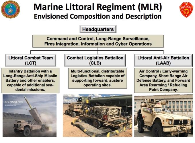 “濒海作战团”虽然叫团,但实际编制大概只有2000人左右,有大量的火力单元、战场监视单元都实现了无人化。这是因为在美军的设想里,这是一支“守岛孤军”,人数的精简也部分摆脱了对后勤保障的高依赖性。从编制架构上看,“濒海作战团”以濒海战斗营、濒海防空营、作战后勤保障营为基本单元构成。指挥机构是一个团级指挥所,负责指挥控制、远程监视、火力整合、信息及网络任务等。