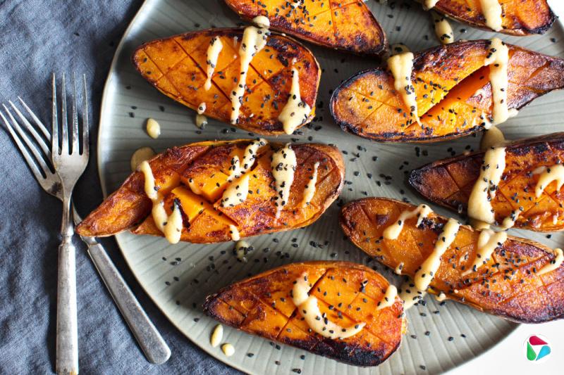 佐以咸鲜酱汁与芝麻,这道红薯菜肴精致得足以亮相感恩节餐桌,亦可搭配绿叶菜与谷物成为平日晚餐的主食。