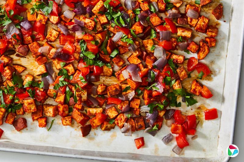 这餐的满足感不逊于任何谷物碗,且制作更简便——所有配料皆可一盘烘烤完成。