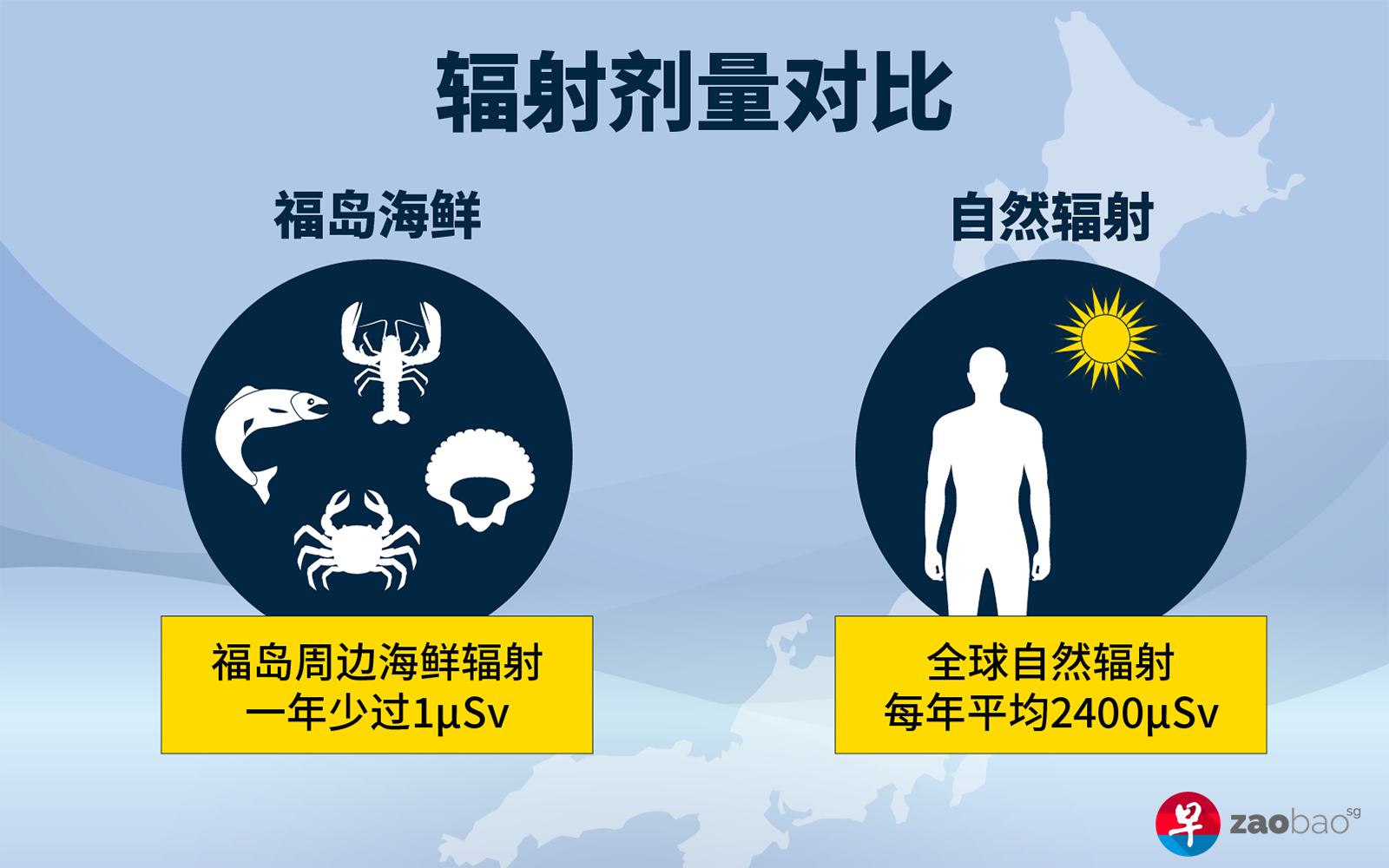 独立专家团队和国际原子能机构的评估也显示,大量食用福岛周边海鲜的消费者,一年承受的辐射剂量预计不到1微西弗,远低于人类一年平均承受的2400微西弗自然辐射。