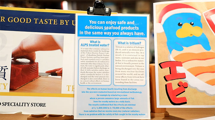 其中,日本人气超市Don Don Donki只发来照片和简短回复,说超市已在门店各处张贴告示提供ALPS处理水和氚的相关信息以消除食客疑虑。