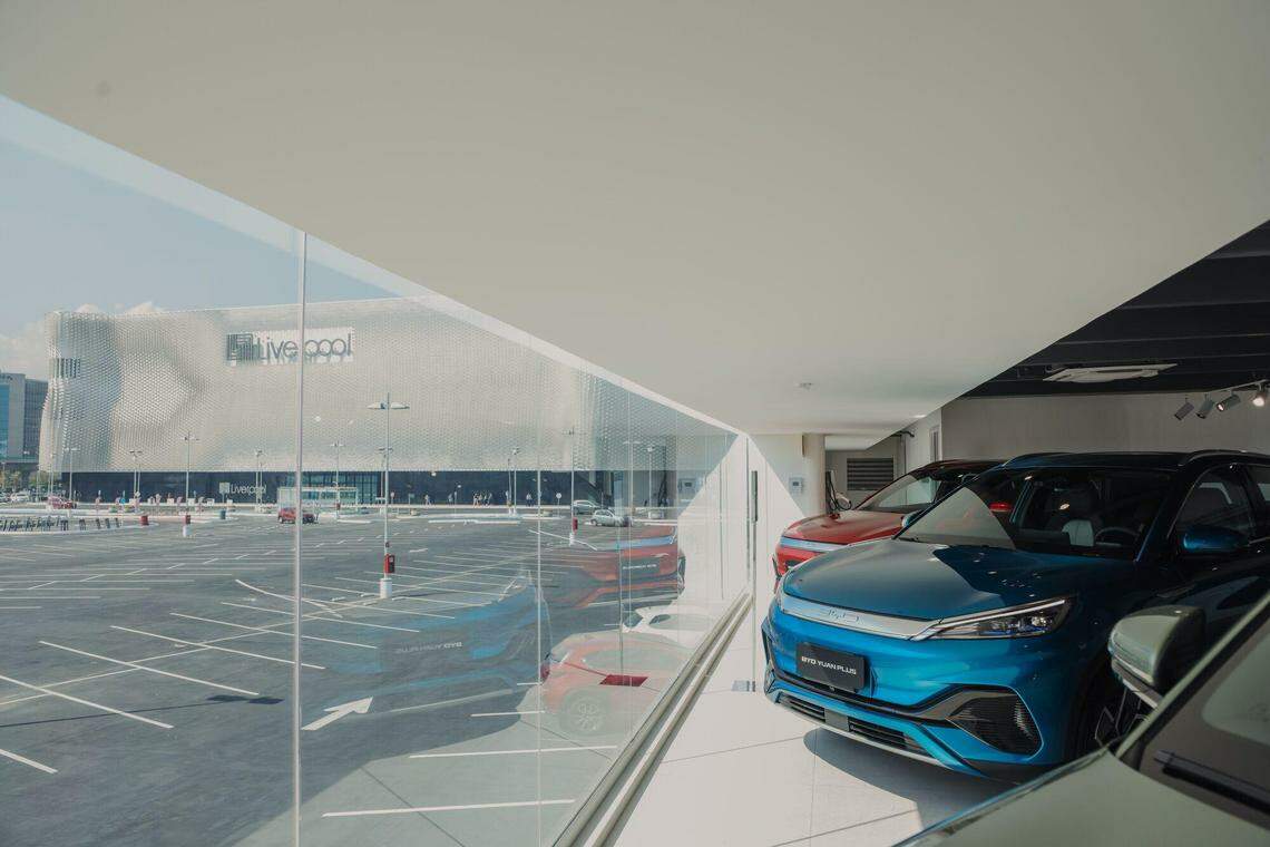 中国比亚迪公司在墨西哥最大的零售连锁运营商利物浦设立了展厅。10月31日的照片显示墨西哥市的利物浦百货商场内的比亚迪车子。(彭博社)
