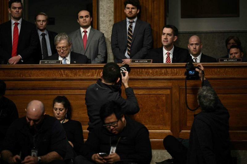 科顿(右)在1月31日举行的参议院司法委员会听证会上,询问周受资对当年中国天安门广场抗议事件的看法后,被批无法区分亚洲人。(法新社)