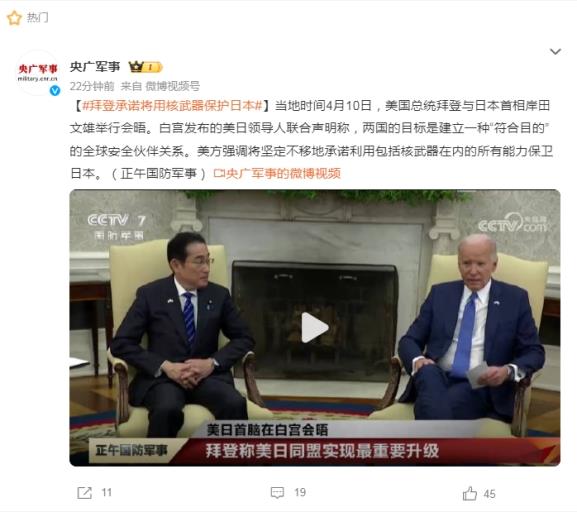 据央广军事微博,当地时间4月10日,美国总统拜登与日本首相岸田文雄举行会晤。白宫发布的美日领导人联合声明称,两国的目标是建立一种“符合目的”的全球安全伙伴关系。美方强调将坚定不移地承诺利用包括核武器在内的所有能力保卫日本。