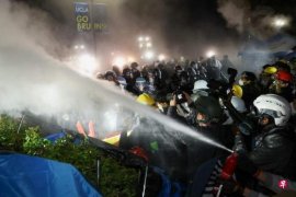 在拜登发表讲话之际,美国各地正加大力度针对大学校园内的亲巴勒斯坦抗议活动。在加州大学洛杉矶分校,身穿防暴装备的警察拆除了一个抗议营地。