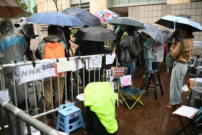在法庭外,约有100人一早就在倾盆大雨中撑伞排队,争取进入法庭旁听。法院周围部署了数百名警察维持秩序。
