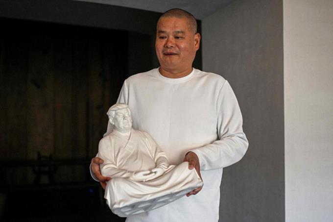 中国原创者洪金世在厦门的个人工作室内摆放着特朗普的陶瓷佛像雕塑。图摄于去年12月9日。(法新社)