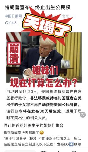 有网民直言:“刚到美国,天塌了……计划很久赴美生子,想着特朗普要上台,赶在1月20日之前入境;时差还没倒好,就看到说不再给宝宝身份了!”