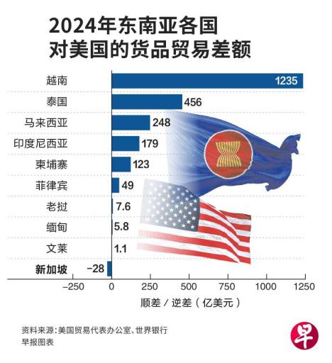 亚细安10国对美国的货品贸易顺差在2024年达到2277亿美元(约3046亿新元),占全球对美货贸顺差约19%。当中,唯有新加坡对美呈现逆差;越南、泰国和马来西亚的顺差最显著,尤其越南的顺差更是全球第三,仅次于中国和墨西哥,是美国发动关税战的一个显眼潜在目标。